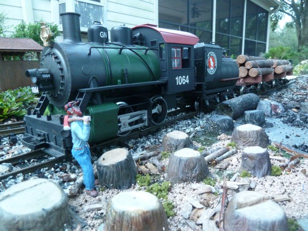The layout of Centralia Garden Railroad is over 12′ X 60′ located in my backyard in Spring Hill, Florida. The layout was based on Centralia, a logging town in West Central Florida, that existed from 1900 until 1922. Because there are only a few photographs from the early 1900’s of Centralia, and nearly no remains from the town, lots could be left to one’s imagination and creativity. So, below are current photographs of the model railroad town as created by the “engineer”.