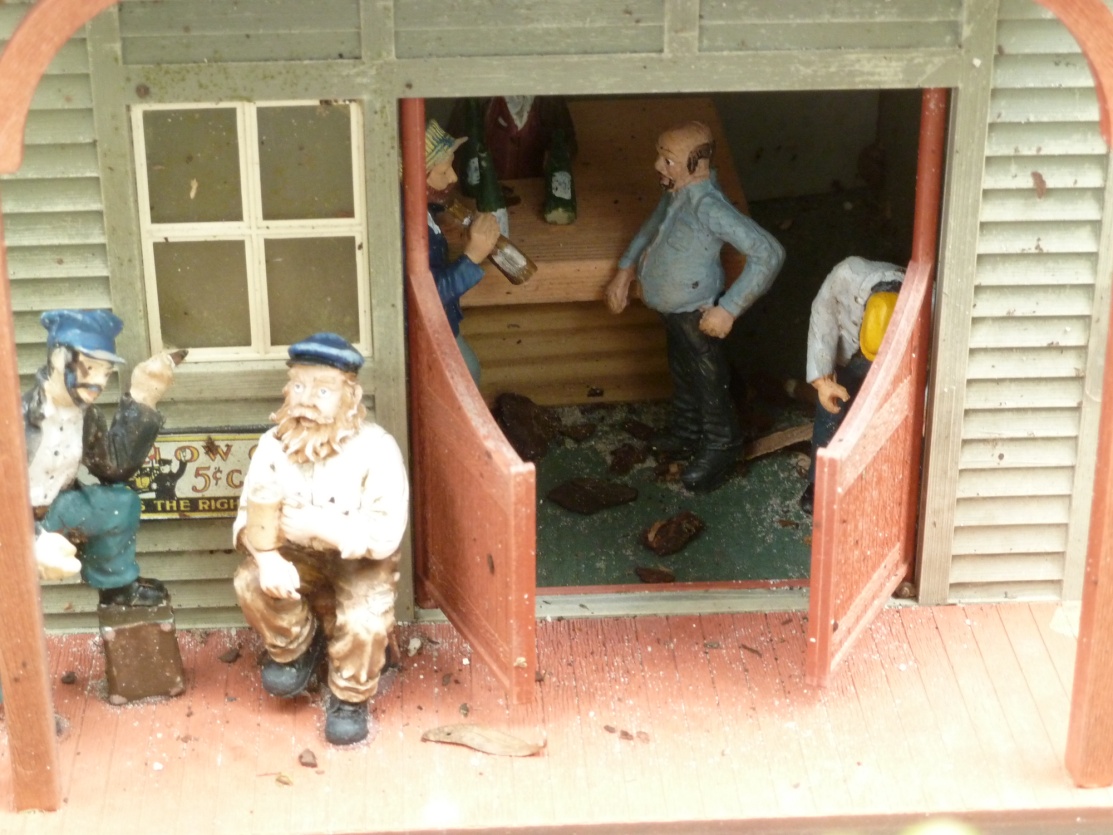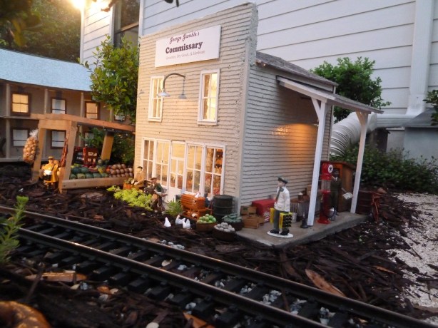 When building the commissary, I felt it was important to make it as realistic as possible. So I included a pot-bellied stove with two-storied shelves of merchandise. Although it is difficult to see, my commissary is lighted so you can see the shelves of merchandise and the pot-bellied stove in the middle of the store with folks gathered around in conversation.