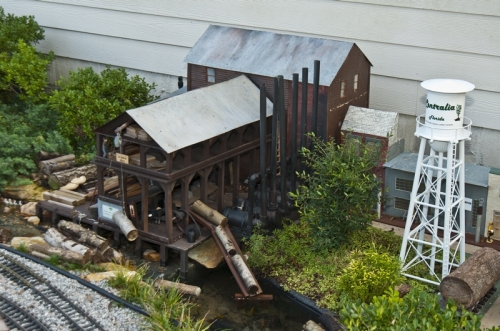 In 1910 mill that employed over 1000 people is modeled here in the middle of the layout. Close by is a model of the water tower with the famous log that was seen in photographs recording one of the largest logs ever cut. In the History of Centralia section, the original photos of the mill, water tower and log may be viewed.