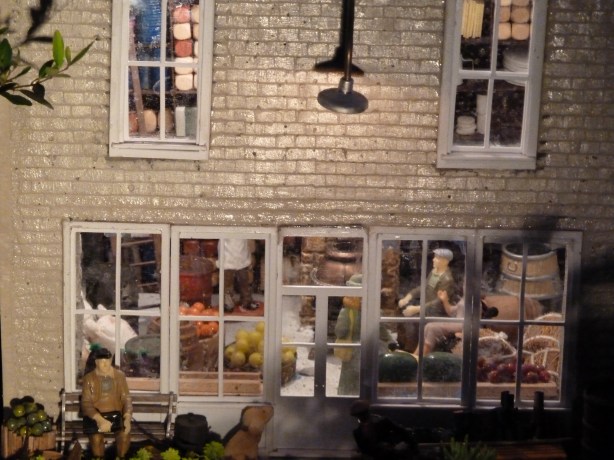 In the early 1900’s, Gambles Commissary was one of the largest dry goods and grocery store in Florida. The commissary had hours from 6 AM until 10PM daily. Since I have been unable to locate photos of the exterior of the building, I used a couple model buildings that I purchased for the commissary. The fruit and vegetables in the market are mostly made of “magic sculpt”epoxy molding clay or painted beads. The baskets are painted beverage caps that are filled with painted beads or molded fruit.