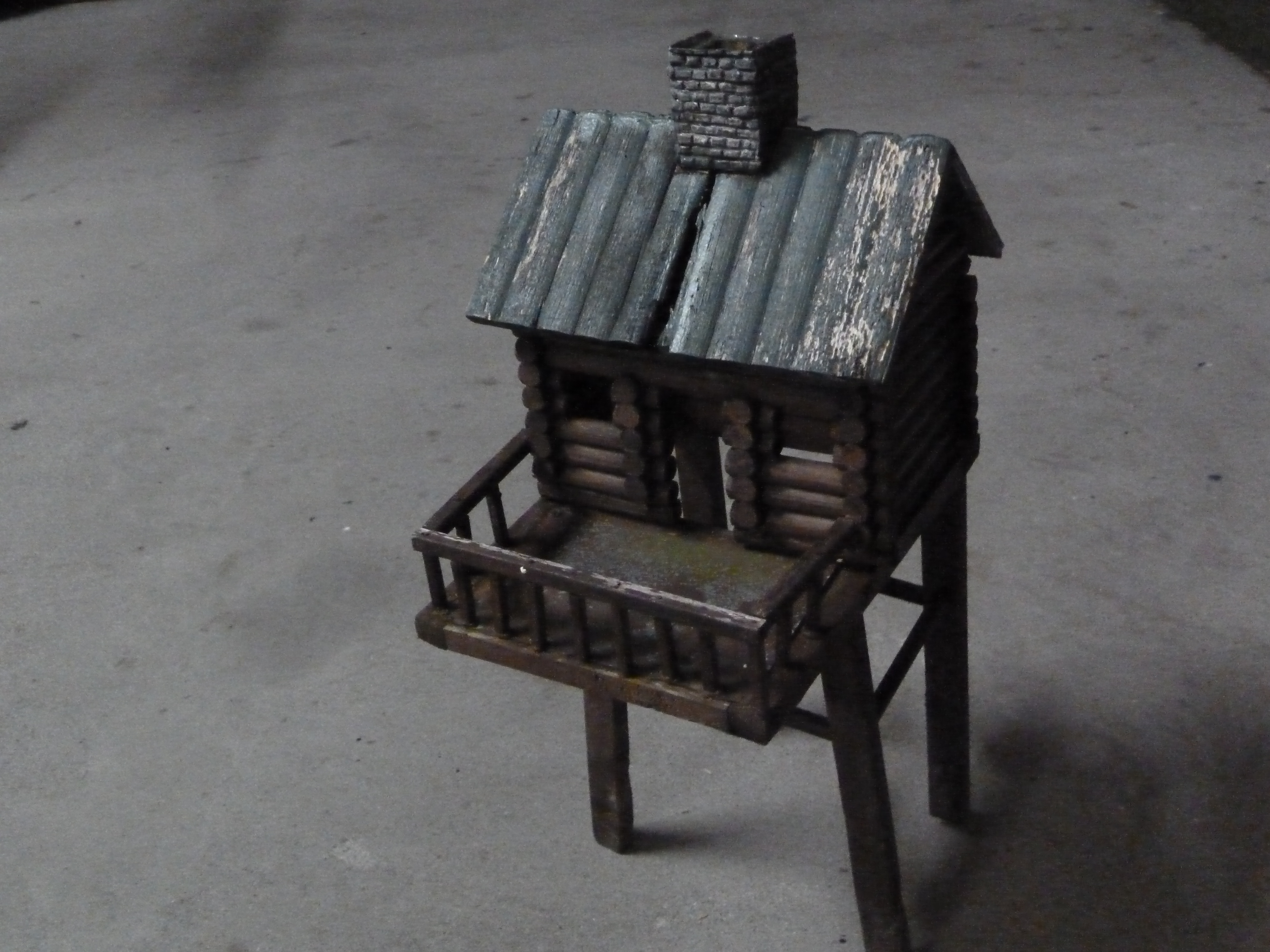 Several years when shopping for Christmas items for the Centralia Garden Railroad, I ventured into Michaels and found an interesting little cabin. I bought it and then modified it by making it into a stilt house and adding a front porch. On the layout, the cabin is located near Weeki Wachee Springs area and is the home to a model mermaid. However, the original construction material – basswood, was not the best quality for outdoor use and has weathered poorly. The roof has needed repair several times and now needs it again as you can see below: